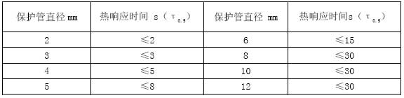 在溫度階躍變化時(shí),溫度傳感器的輸出變化至量程變化的50%所需要的時(shí)間稱為熱響應(yīng)時(shí)間,用τ0.5表示。影響τ0.5的因素與保護(hù)管材料、直徑、壁厚有關(guān),而且還與其結(jié)構(gòu)形式、安裝方法、置入深度以及被測(cè)介質(zhì)的流速、種類有關(guān)。下表為不同直徑保護(hù)管的熱響應(yīng)時(shí)間(材質(zhì)為不銹鋼,水流速度為1m/s,測(cè)試數(shù)據(jù)為參考值)
