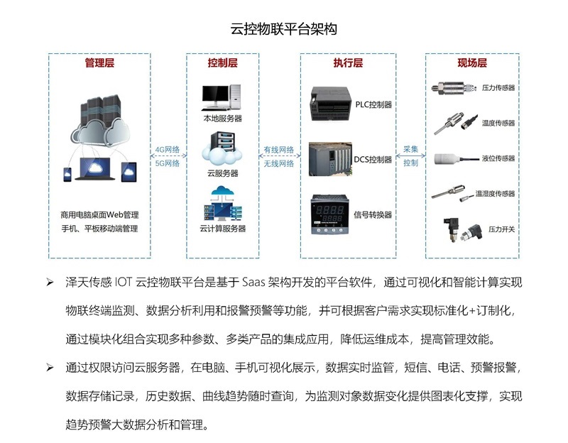 湖南澤天傳感研制的傳感器具有高精度、高靈敏度、高可靠性等特點,已廣泛應(yīng)用于工業(yè)控制、工程機械、化工冶金、能源生產(chǎn)、環(huán)保監(jiān)測、食品醫(yī)療、航空航天等領(lǐng)域。澤天傳感研發(fā)的新一代智能傳感測控技術(shù),已正式應(yīng)用在基于物聯(lián)網(wǎng)傳感技術(shù)的云控物聯(lián)解決方案中,本方案設(shè)計為管控層、執(zhí)行層、現(xiàn)場層三級架構(gòu),利用物聯(lián)網(wǎng)和互聯(lián)網(wǎng)技術(shù),通過現(xiàn)場層的高性能傳感器實時監(jiān)測各種物理量,經(jīng)過控制層利用無線傳輸技術(shù)將數(shù)據(jù)實時傳輸?shù)皆贫耍倮么罅勘O(jiān)測數(shù)據(jù)進行趨勢預(yù)測計算,實現(xiàn)多種參數(shù)、多類產(chǎn)品的集成應(yīng)用,降低運維成本,提高管理效能,為自動化控制、智能化生產(chǎn)等提供了有力支持。