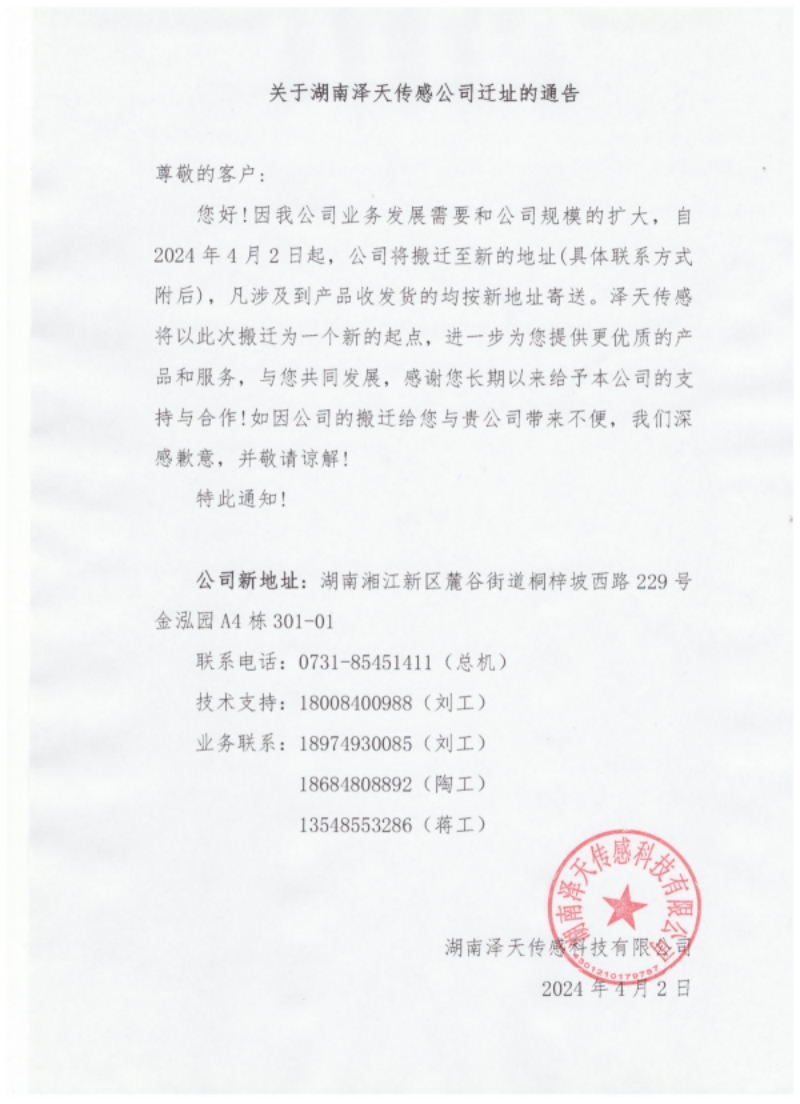 您好!因我公司業務發展需要和公司規模的擴大,自2024年4月2日起,公司將搬遷至新的地址(具體聯系方式附后),凡涉及到產品收發貨的均按新地址寄送。澤天傳感將以此次搬遷為一個新的起點,進一步為您提供更優質的產品和服務,與您共同發展,感謝您長期以來給予本公司的支持與合作!如因公司的搬遷給您與貴公司帶來不便,我們深感歉意,并敬請諒解!